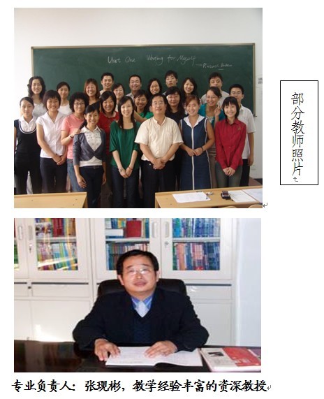 目前,英语专业教研室教师共16人,其中专职11人,兼职5人;教授2人,副教授 2人,讲师 8人,在读博士1名,硕士 14人。专业教师的研究方向涵盖了语言学、英美文学、翻译、语言教育等专业,专业方向分布合理,满足了课程设置的需要。