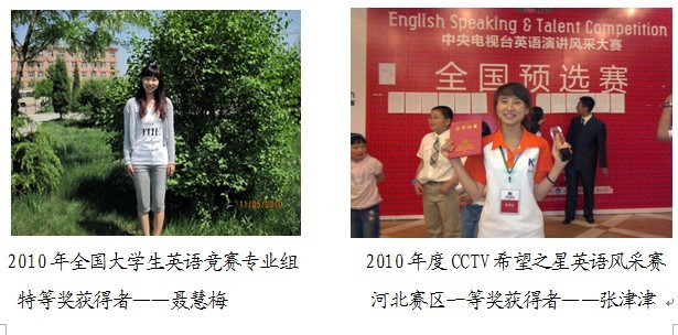 英语专业学生活跃在各种省级和国家级竞赛中并取得佳绩。我专业学生在“外研社杯”全国英语演讲大赛、河北省高校 “世纪之星”英语演讲大赛、中央电视台“希望之星”英语风采大赛、全国大学生英语竞赛的专业组和非专业组中荣获二等奖、三等奖的佳绩,其中张津津同学获2010年度CCTV希望之星英语风采大赛河北省赛区一等奖,聂慧梅同学获2010年全国大学生英语竞赛专业组特等奖;英语专业孙小雨同学还在全国“德艺双馨”大赛中获河北省金奖。