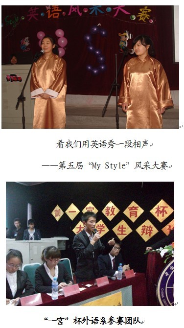 学生的校园文化生活丰富多彩,英语专业学生的专业技能和其它各种才能提供了充分展现和发展的空间。从2006起,我们英语专业在院团委的配合下,每年举办英语文化节活动,包括演讲比赛、英文歌手大赛、英文电影欣赏等,让学生在练中学,学中练,在语言实践中巩固知识、提高能力。“My Style”英语风采大赛已成为代表英语专业学生素质的知名品牌。此外,英语专业学生所组织的“英语文化节”、“学术文化月”、“英语角”、“专家知识讲座”等活动享有盛名。